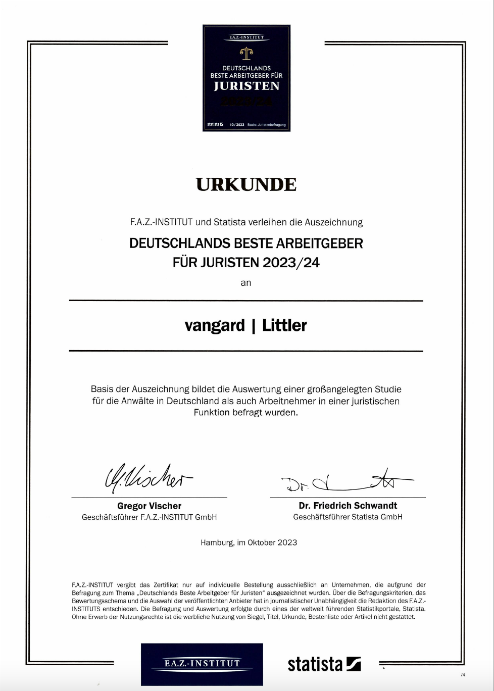 vangard | Littler gehört zu ›Deutschlands Besten Arbeitgebern für Juristen 2023/24‹